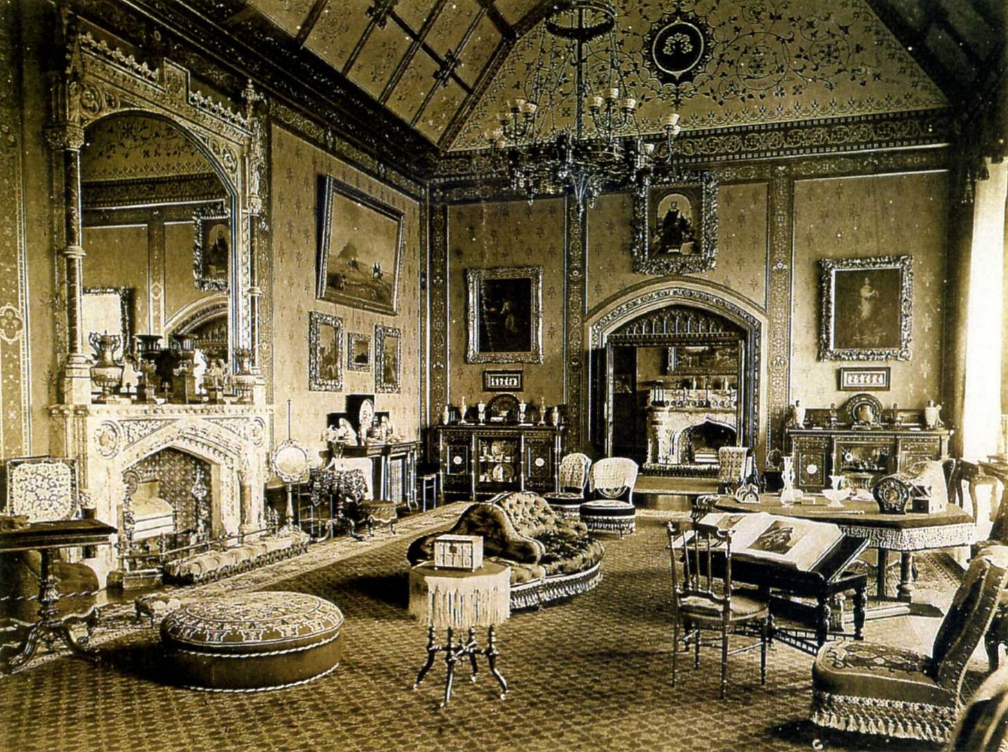 The clutter has been tidied out of the interior design too. Here is Tyntesfield’s drawing room in 1878.