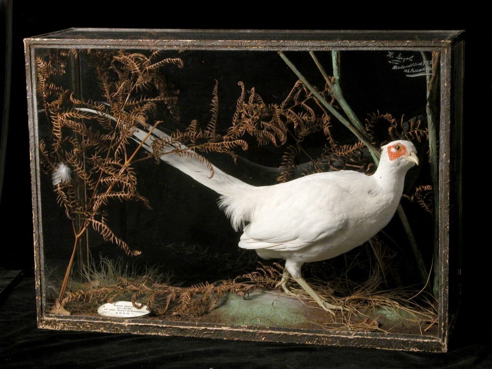 I’m sharing the picture partly because it looks quite a lot like the Traitors’ castle, but anyway. In the entrance halls alone the catalogue records 179 cases of stuffed birds and animals. So many hundreds of individual pieces of taxidermy, the vast majority of which were, I imagine, shot by the owners of the estate, just like our white pheasant friend at the start of the post.
